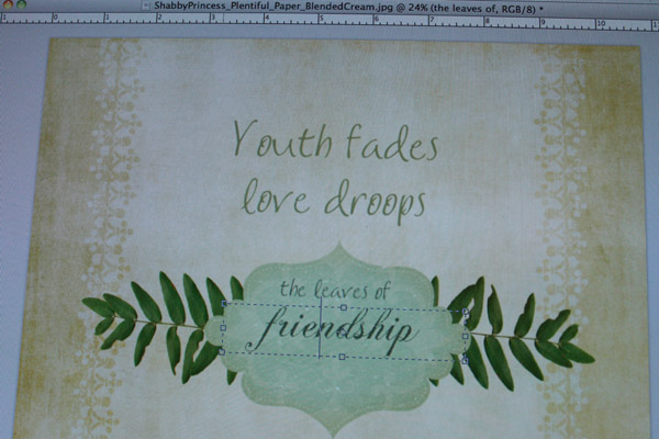 Next place "JournalingPaper" over the center of the foliage. Adjust size by bringing in the sides a little and decreasing the height a little. (I didn't measure this part, I just did what I liked).