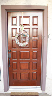 Hubby finished painting our front door. I, being the organized person that I am, forgot to take a before photo, but I did find this. Just imagine that sun bleached wood all over the door.
